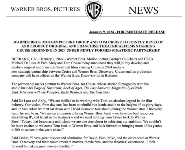 Tom Cruise, stratejik bir işbirliği anlaşması imzalayarak Warner Bros. ile ortaklığını açıkladı. Ünlü oyuncu, gelecekte çekeceği orijinal ve potansiyel seri filmleri için Warner Bros. çatısı altında çalışacak. Bu anlaşmanın bir sonucu olarak, Cruise ve yapım şirketi için Warner Bros. ana merkezinde özel bir ofis katı tahsis edilecek.