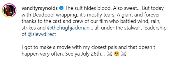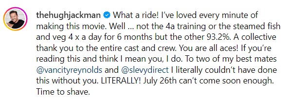 Grevin sona ermesiyle devam eden "Deadpool 3"ün çekimlerinin tamamlandığı müjdesini Hugh Jackman duyurdu. Çekimlerin ardından, traş olup ve sakallarından kurtulan Jackman, sosyal medya hesabından Ryan Reynolds ve Shawn Levy'ye teşekkürlerini dile getirerek 26 Temmuz'u sabırsızlıkla beklediği notu ile sosyal medyadan paylaştı.