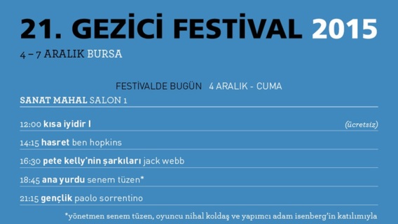 Gezici Festival Bursa'ya taşındı! İlk günün filmleri arasında Ana Yurdu da var, ayrıca gösterim sonrası yönetmen Senem Tüzen, başrol oyuncusu Nihal Koldaş ve yapımcı Adam Isenberg ile söyleşi gerçekleştirilecek.