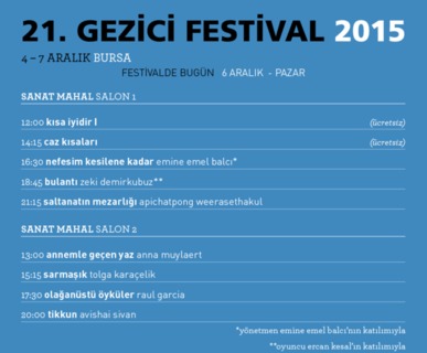 Gezici Festival'in 6 Aralık Pazar programı yine dopdolu... Nefesim Kesilene Kadar'ın yönetmeni Emine Emel Balcı ve Bulantı'nın oyuncularından Ercan Kesal ile söyleşiler gerçekleşecek.