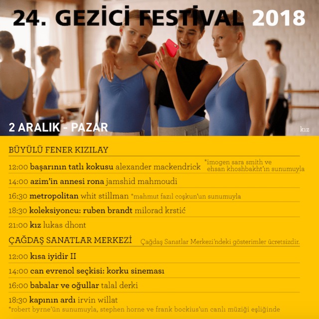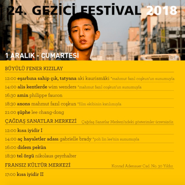 Sinop ve Kastamonu gösterim programları belli oldu!24. Gezici Festival 7-9 Aralık tarihleri arasında Sinop Belediyesi ve Telvin Sanat Akademi katkılarıyla Halk Eğitim Merkezi'nde! Tüm gösterimler ücretsiz. Ayrıntılı program için >> http://bit.ly/GF2018Sinop