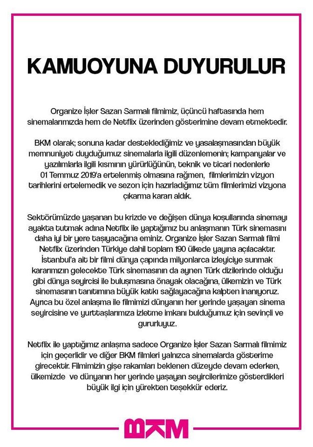 Dünyadaki örneklerinde ülkeler kendi ulusal sinema sektörünü korumak amaçlı olarak, filmlerin sinema gösterimleri ile dijital platformlardaki gösterimleri arasında 4-6 ay arasında bir süre sınırı koymuştur. Ve bu düzen çoğu ülkede kanunla değil sektörel vizyon ve etik değerlerle korunur. Maalesef yaşanan gelişmeler benzer sınırlama ve düzenleme konusunda ülkemizde kanun yapıcının acilen devreye girmesi gerektiğini göstermektedir.” Şeklinde ifadelere yer verdi.