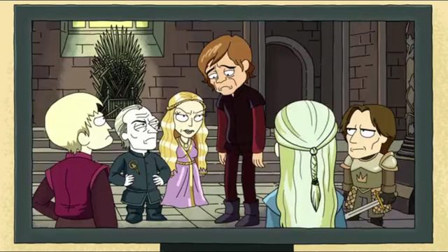 Game of Thrones’un bilinen en büyük hayranlarından olan ikili, Game of Thrones’u da unutmayarak Rick and Morty’nin 1. sezon 8. bölümünde ünlü dizinin boyutlar arası kablolu televizyonda gösterimini ihmal etmemişlerdi. Dizinin, paralel bir evrendeki parodisinde, Tyrion Lannister çok uzun bir adam olarak canlandırılırken geri kalan tüm karakterler ise cüce boyutlarında ekrana gelmişti.